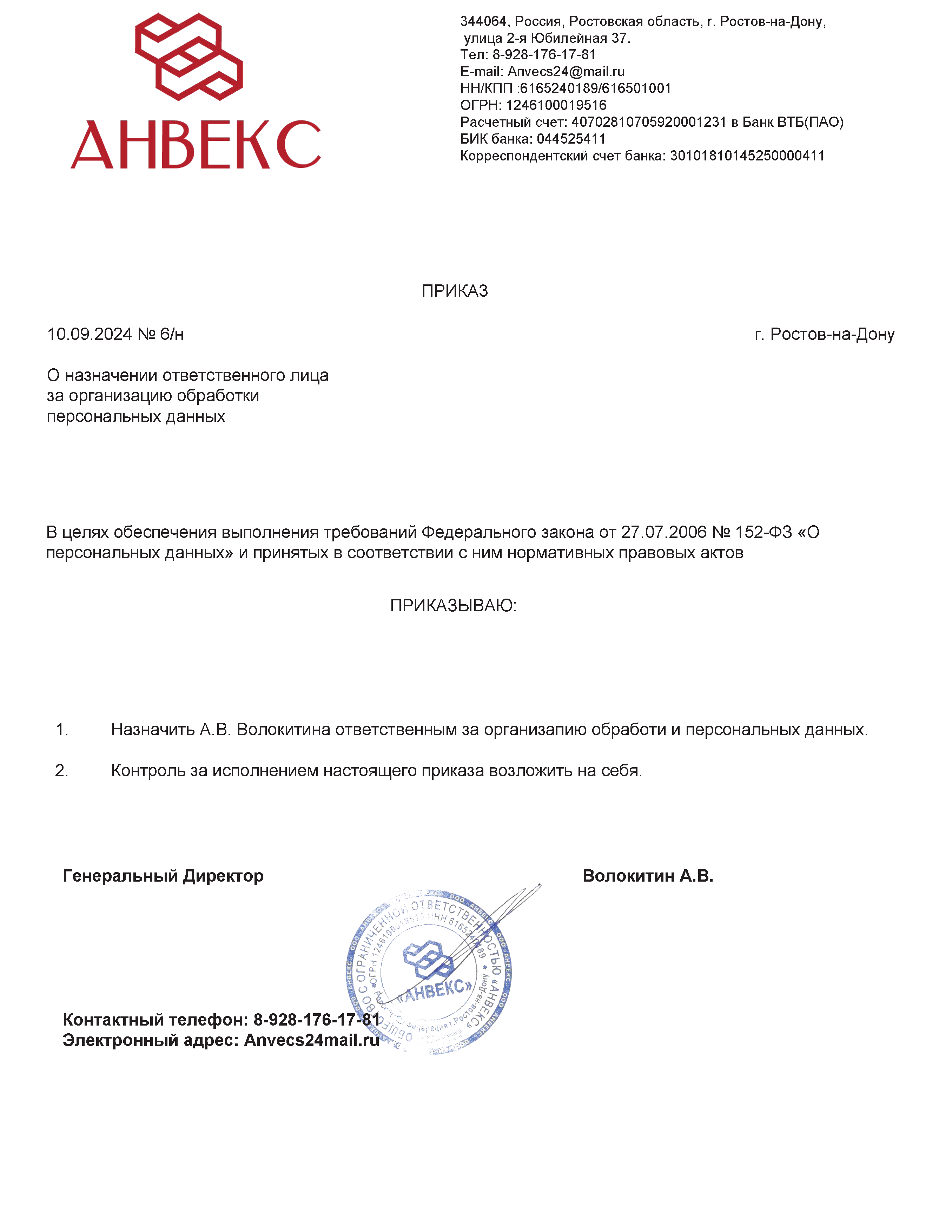 • 7. Оператор –компания ООО «АНВЕКС» в лице Генерального директора Волокитина Антона Валерьевича, действующего на основании Устава (ИНН/КПП 6165240189/616501001, ОГРН 1246100019516 ), e-mail (электронная почта): anvecs24@mail.ru самостоятельно или совместно с другими лицами организующий и (или) осуществляющий обработку персональных данных, а также определяющий цели обработки персональных данных, состав персональных данных, подлежащих обработке, действия (операции), совершаемые с персональными данными.